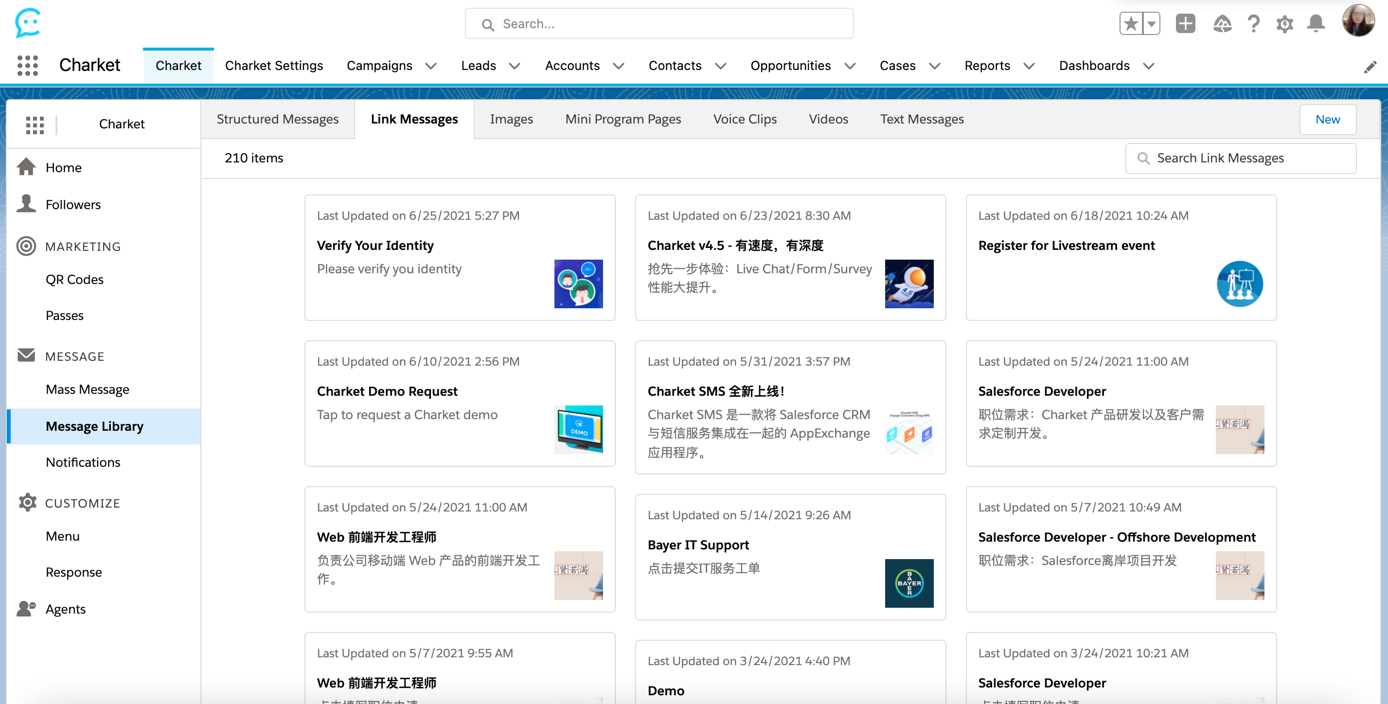 为了适配微信新增的草稿箱和发布接口,Charket v4.6版本支持创建、获取、同步和修改草稿箱中的图文,支持发布草稿箱的图文。其中,在群发页面、Live Chat 和 Marketing Cloud 的 Journey Builder 中只能群发草稿箱的图文;而在扫描二维码,触发关键字,点击菜单等功能中可以发送已经发布的图文。草稿箱的具体功能可以点击文档查看。